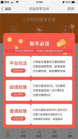 1.首次登录送1元,转发被阅读一次计费高达4毛,全网最高单价。 2.提现门槛超低,首次提现5元,后续10元起,当天到账安全稳定。 3.累计2级收徒30%提成奖励,每个徒弟额外奖励共11元;邀请好友越多,收益越多。无上限。