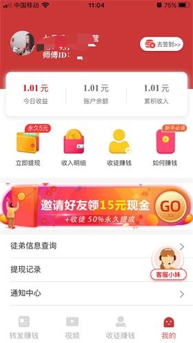 1.注册即刻送一元,转发有效点击单价永久7毛,转发赚钱实力平台。 2.收徒奖励最高奖励15元,还有二代累计50%分成+额外奖励红包1个。 3.收益永久满5元可微信提现,当天即可到账,支持每天签到领钱。