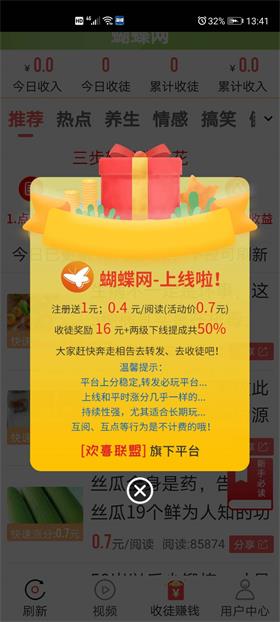 1.新用户注册就送1元,点击单价0.7元(平常4毛)涨分飞速。分享热点资讯就能赚零花钱! 2.收徒奖励多,每位最高送16元按梯度发放,收徒享受徒弟30%+徒孙20%永久收益奖励。 3.首次满5元微信提现,后继正常10元起,当天就能到账,提现稳定,实在平台。