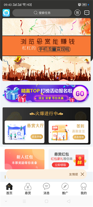 给学生,宝妈,自由职业者提供赚钱的工作机会,大量的任务,随时提现。千万用户首选兼职的神器。注册,下载,分享等任务悬赏形式。悬赏红包,任务赏金,分享奖励。浏览网页,推广产品都能赚钱.