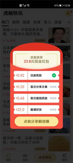 1.注册送0.92元红包,轻松转发就赚钱,有效点击单价推广期间高达0.7元。支持每天签到领现金。 2.邀请奖励丰富,每位好友最高梯度奖励19元,还可享受一级20%+二级10%提成奖励。 3.具备独特抢红包功能,首次5元提现,提现立即到账,没有套路,不用投资,提现稳定。