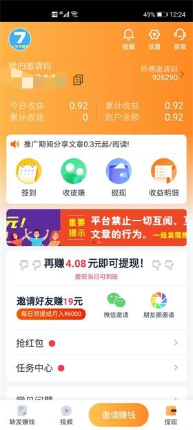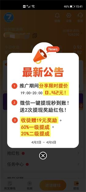 1.注册送0.92元红包,转发文章赚钱,有效点击单价0.3元(限时提价0.42元)。 2.收徒快速赚钱,收徒奖励可获得19元,享受活动额外60%+20%分成奖励。 3.首次5元提现,提现立即到账,提现送2次红包,拒绝套路,真时涨分。提现稳定。