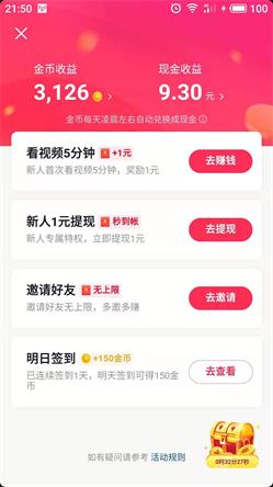 1、活动期间注册送1到10元现金,提现秒到,填写邀请码:888973874就送2元红包。 2、满0.3元即可提现支付宝,看视频10000金币兑换1元现金,每天签到领金币。 3、邀请朋友一起看奖励更高,每邀请一位好友可赚38元,邀请好友数量不上限,邀的多赚的多。