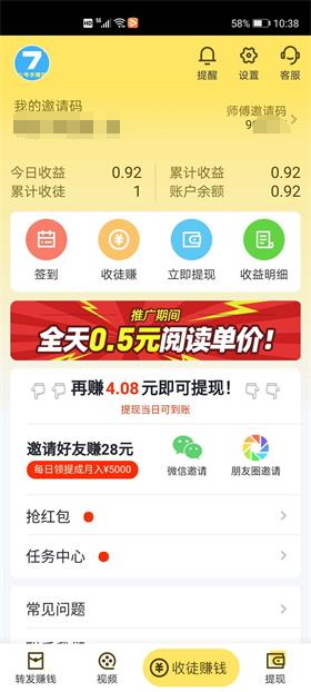 1.分享文章赚钱模式,推广期间全天单价0.5元,记得每天签到领红包。 2. 收徒狂赚模式,收徒陆续可获得28元+享受30%的两级徒弟永久分成。 3.平台提现稳定,首次新人专享5元提现,后续长期10元起提现,当天到账。