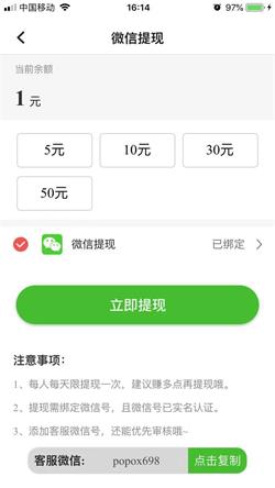 1.新用户注册,立马送1元现金奖励。推广期间全天0.3元阅读单价。 2.收徒轻松奖励高,每收一位徒弟奖励15元+享受2级徒弟50%永久进贡。 3.微信一键提现,5元即可提现,最快1秒到账。更有签到红包,涨分飞快。