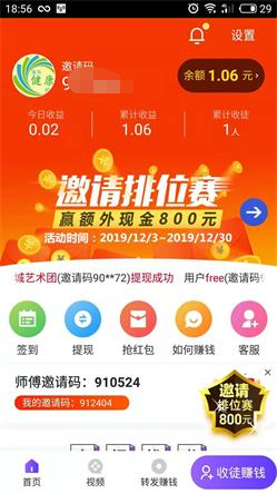 1.分享文章赚钱模式,推广期间全天单价0.35元,每日签到领无门槛现金红包。 2.收徒陆续可获得16元+50%收徒成功前5天可获得徒弟50%进贡,后继20%永久进贡。 3.首次5元提现,后续长期10元提现,支持微信和支付宝。当日到账。