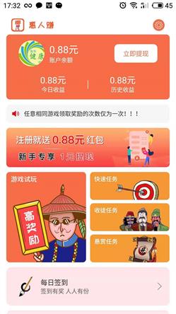 1、新手注册一元提现。 2、新用户注册送0.88元红包。 3、签到送现金红包,人人有份。 4、推荐好友,好友完成一元提现任务,奖励1元红包,上不封顶。 5、推荐好友,好友每完成一个任务,奖励0.25元,上不封顶。