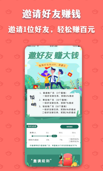 1、签到赚钱:坚持打卡签到赚98元,惊喜送不停 2、邀请赚钱:成功邀请一个好友可赚50元。 3、提现门槛:1元即可提现,三分钟审核赚钱任务。 4、多种任务赚钱模式,让您躺着赚钱,轻松月赚过万。