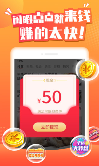 【热点资讯】 热点推荐,内容丰富集合搞笑,娱乐,生活,星座,情感,养生,健康,影视,旅游,历史,宠物等多诸多方面资讯内容,实时推送,看看赚钱! 【潮流视频】 草根、网红、vlog达人层出不穷,休闲看点搞笑视频应有尽有!赚赚钱! 【免费小说】 海量小说免费看,玄幻、都市、爱情、悬疑随手看! 【趣味游戏】 转盘,答题,刮刮乐,休闲游戏,玩玩赚钱! 【活动奖励】 活动多,搞不停、玩法多样,邀请好友一起赚零花! 【大额红包】 大额红包随机拆,更有惊喜等你拿! 【精彩社群】 评论、分享、交流足不出户,广交天下好友!